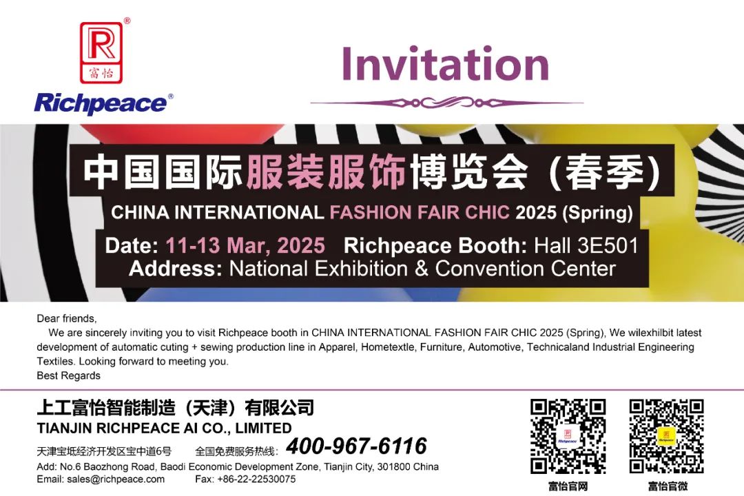 In the pleasant month of March, a significant global industry event is set to take place as planned. The CHINA INTERNATIONAL FASHION FAIR CHIC 2025 (Spring) will officially open at the National Exhibition & Convention Center from March 11th to 13th! TIANJIN RICHPEACE AI CO., LIMITED invites you to visit our booth, Hall 3E501, for an exciting exhibition experience. Engage in face-to-face discussions, experience quality firsthand, witness excellence, and explore innovation together.展会开幕已进入倒计时阶段,QY千亿国际在此诚挚邀请您参加2025中国国际服装服饰博览会 (春季),届时QY千亿国际将携QY千亿国际服装全自动模板缝纫机、QY千亿国际平板扫描数字化仪、QY千亿国际全自动旋转机头模板缝纫机、QY千亿国际第二代高速喷墨绘图仪、QY千亿国际立式喷墨切割机、QY千亿国际平板喷墨切割一体机、QY千亿国际电脑模板切割机、QY千亿国际电脑五合一绣花机、QY千亿国际电脑平绣绣花机、QY千亿国际摄像定位激光雕刻切割机华丽亮相,春意盎然的展会季,QY千亿国际服博会上不见不算哦~